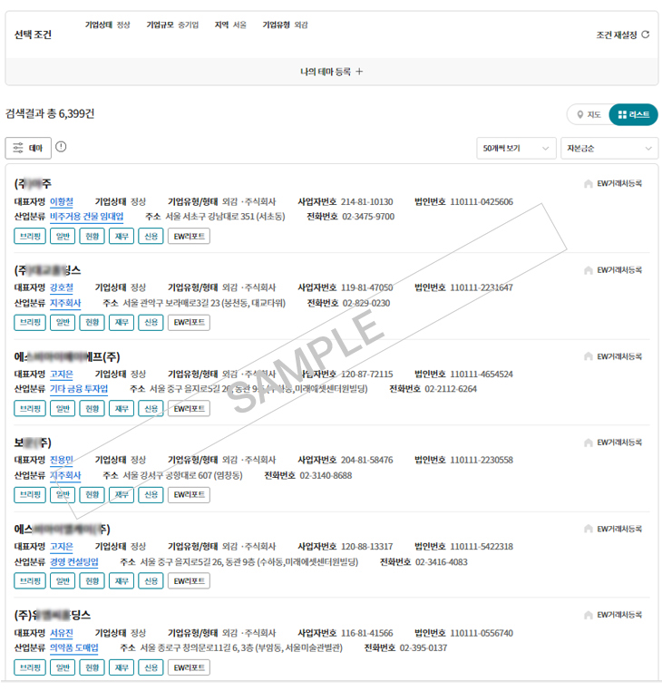 종업원, 업종 등)을 통해 다수의 기업을 찾는 맞춤형 서비스